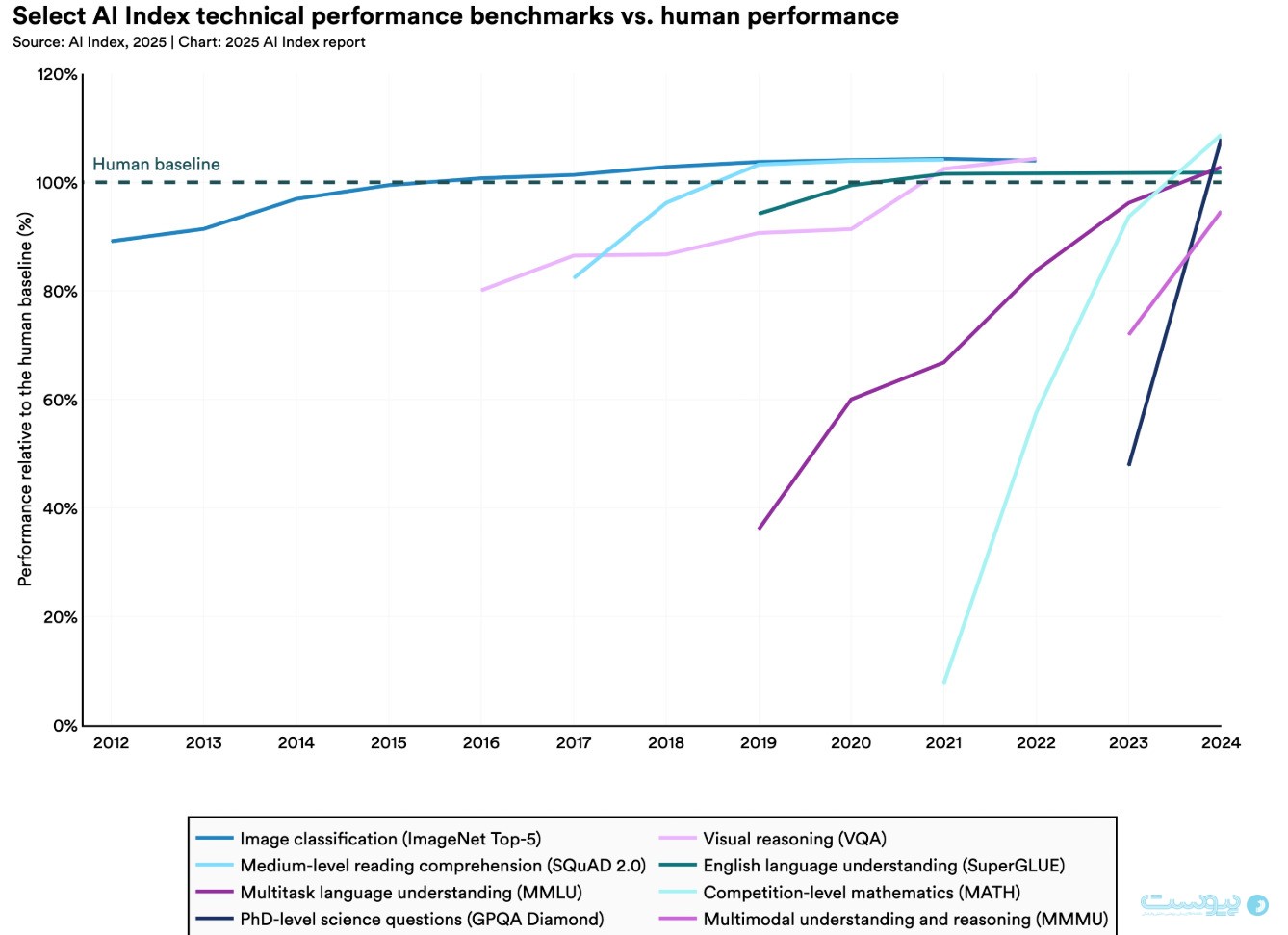 در سال ۲۰۲۳، پژوهشگران معیارهای جدیدی مانند MMMU، GPQA و SWE-bench را معرفی کردند تا توانایی سیستمهای پیشرفته هوش مصنوعی را آزمایش کنند. تنها یک سال بعد، عملکرد این سیستمها بهطور چشمگیری افزایش یافت: امتیازات به ترتیب ۱۸.۸، ۴۸.۹ و ۶۷.۳ واحد درصد در MMMU، GPQA و SWE-bench رشد کردند. فراتر از معیارهای سنجش، سیستمهای هوش مصنوعی پیشرفتهای قابل توجهی در تولید ویدئوی باکیفیت داشتند و در برخی موقعیتها، عاملان مبتنی بر مدلهای زبانی حتی در وظایف برنامهنویسی با محدودیت زمانی، از انسانها پیشی گرفتند.