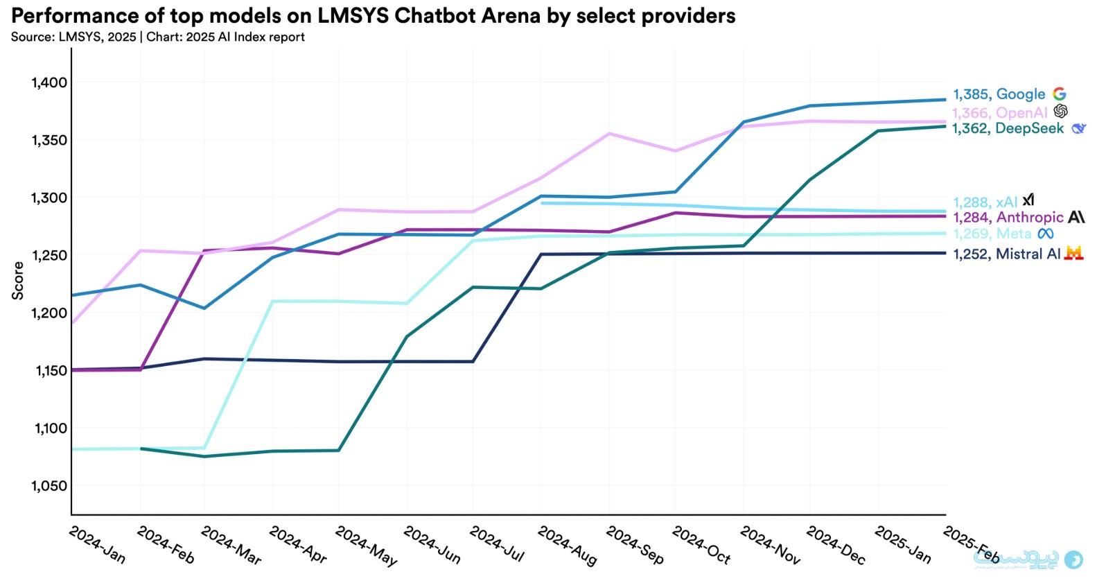 در سال ۲۰۲۴، تقریباً ۹۰٪ مدلهای برجسته هوش مصنوعی از صنعت آمدهاند، در حالی که این رقم در سال ۲۰۲۳، ۶۰٪ بود، و دانشگاهها همچنان منبع اصلی تحقیقات پرارجاع باقی ماندهاند. اندازه مدلها بهسرعت در حال افزایش است: محاسبات آموزش هر پنج ماه دو برابر، دادهها هر هشت ماه دو برابر و مصرف انرژی سالانه افزایش مییابد. با این حال، فاصله عملکردی مدلها کاهش یافته است: تفاوت امتیاز بین مدلهای رتبه اول و دهم در یک سال از ۱۱.۹٪ به ۵.۴٪ کاهش یافته و دو مدل برتر اکنون تنها ۰.۷٪ از هم فاصله دارند. مرز پیشرفت روزبهروز رقابتیتر و شلوغتر میشود.