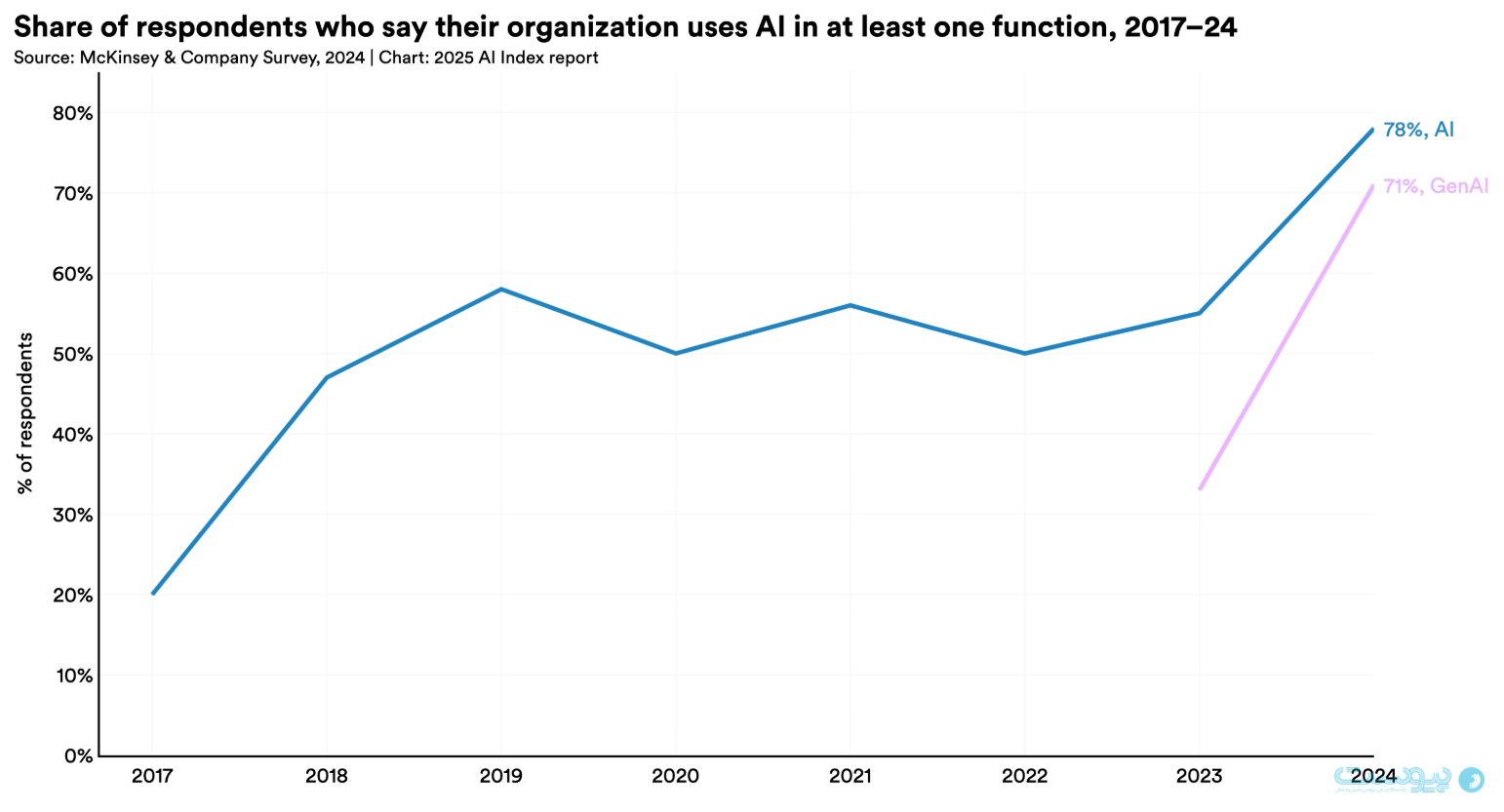 استفاده کسبوکارها از هوش مصنوعی نیز شتاب گرفته است؛ در سال ۲۰۲۴، ۷۸ درصد سازمانها از هوش مصنوعی بهرهبرداری کردند، در حالی که این رقم در سال قبل تنها ۵۵ درصد بود. همزمان، مجموعهای رو به رشد از مطالعات نشان میدهد که هوش مصنوعی بهرهوری را افزایش میدهد و در بسیاری موارد به کاهش شکاف مهارتی در نیروی کار کمک میکند.
