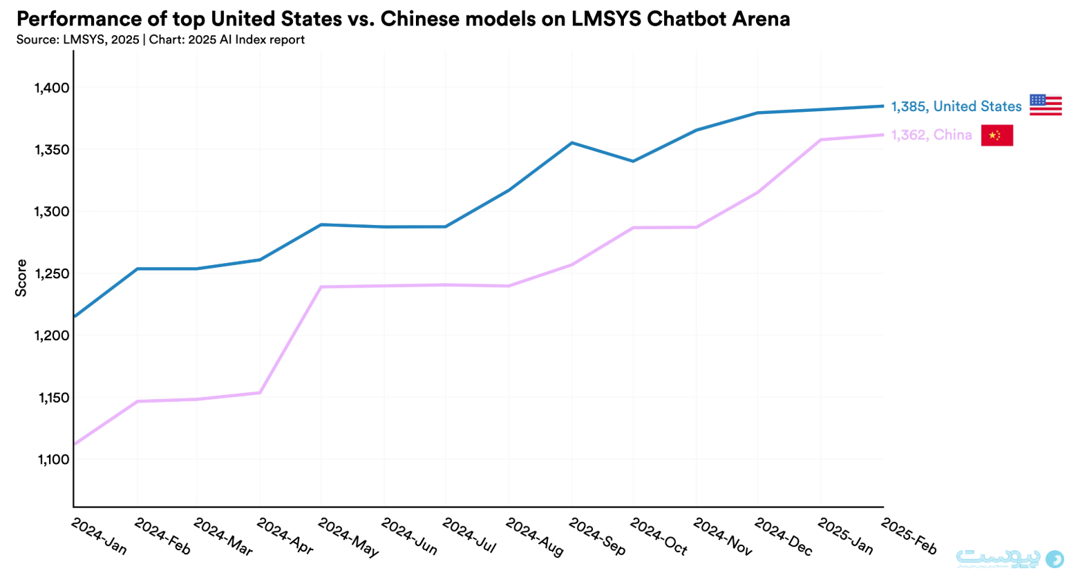 در سال ۲۰۲۴، مؤسسات مستقر در آمریکا ۴۰ مدل هوش مصنوعی برجسته تولید کردند که بهطور قابل توجهی از ۱۵ مدل چین و ۳ مدل اروپا پیشی گرفت. در حالی که آمریکا در تعداد مدلها پیشتاز است، مدلهای چینی بهسرعت فاصله کیفی را کاهش دادهاند: تفاوت عملکرد در معیارهای اصلی مانند MMLU و HumanEval از ارقام دو رقمی در سال ۲۰۲۳ به تقریباً برابری در ۲۰۲۴ رسید. همزمان در سال ۲۰۲۵، چین در زمینه انتشارات علمی و ثبت اختراعات در حوزه هوش مصنوعی همچنان پیشتاز است. در عین حال، توسعه مدلها روزبهروز جهانیتر میشود و مناطق قابل توجهی مانند خاورمیانه، آمریکای لاتین و آسیای جنوبشرقی نیز شاهد عرضه مدلهای جدید هستند.