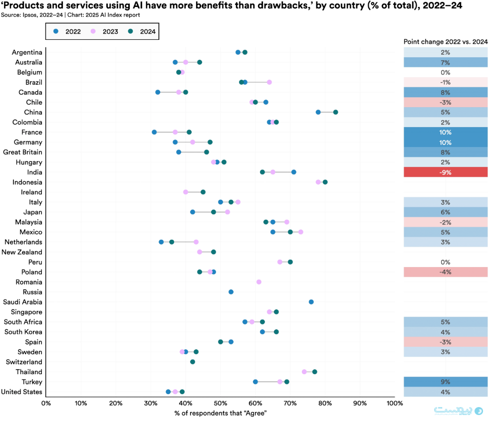 در کشورهایی مانند چین (۸۳٪)، اندونزی (۸۰٪) و تایلند (۷۷٪) اکثریت قاطع، محصولات و خدمات هوش مصنوعی را بیشتر مفید از مضر میدانند. در مقابل، خوشبینی در کشورهایی مانند کانادا (۴۰٪)، ایالات متحده (۳۹٪) و هلند (۳۶٪) بسیار کمتر است. با این حال، روند نگرشها در حال تغییر است: از سال ۲۰۲۲، خوشبینی در چندین کشور که پیشتر دیدگاه تردیدآمیز داشتند، از جمله آلمان (+۱۰٪)، فرانسه (+۱۰٪)، کانادا (+۸٪)، بریتانیا (+۸٪) و ایالات متحده (+۴٪) بهطور قابل توجهی رشد کرده است.