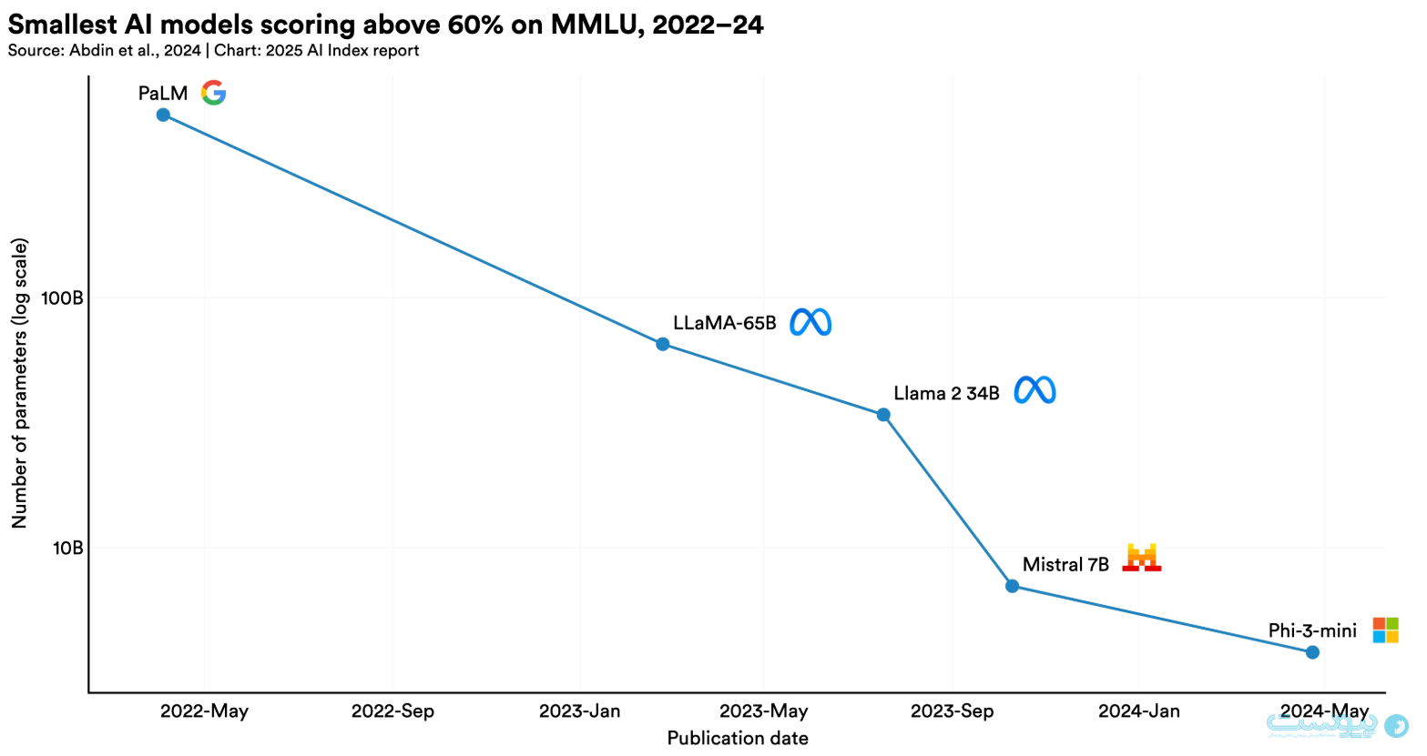 با پیشرفت مدلهای کوچک و توانمندتر، هزینه اجرای یک سیستم با سطح عملکرد GPT-3.5 بین نوامبر ۲۰۲۲ تا اکتبر ۲۰۲۴ بیش از ۲۸۰ برابر کاهش یافته است. در سطح سختافزار، هزینهها سالانه ۳۰٪ کاهش یافته و بهرهوری انرژی هر سال ۴۰٪ بهبود یافته است. همچنین، مدلهای با وزن باز (Open-weight) فاصله خود را با مدلهای بسته کاهش دادهاند و تفاوت عملکرد را در برخی معیارها از ۸٪ به تنها ۱.۷٪ در عرض یک سال رساندهاند. مجموع این روندها بهسرعت موانع ورود به هوش مصنوعی پیشرفته را کاهش میدهند.