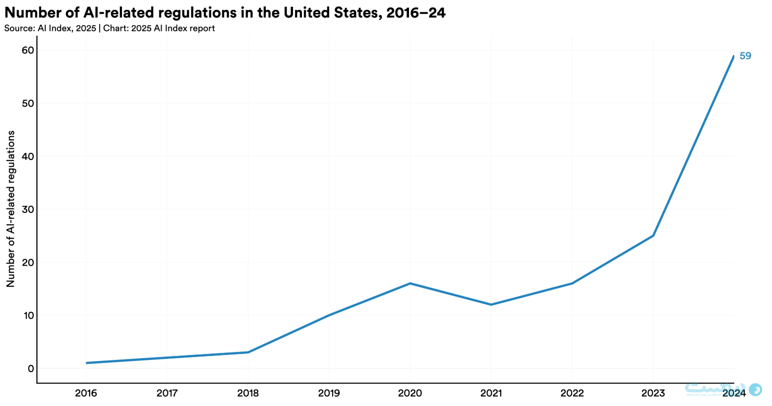 در سال ۲۰۲۴، سازمانهای فدرال آمریکا ۵۹ مقرره مرتبط با هوش مصنوعی صادر کردند که بیش از دو برابر سال قبل بود و توسط دو برابر تعداد سازمانها اجرا شد. در سطح جهانی، اشاره به هوش مصنوعی در قوانین ۷۵ کشور از سال ۲۰۲۳ تاکنون ۲۱.۳٪ افزایش یافته و نسبت به سال ۲۰۱۶ تقریباً ۹ برابر شده است. همزمان، دولتها سرمایهگذاریهای گستردهای انجام میدهند: کانادا ۲.۴ میلیارد دلار، چین ۴۷.۵ میلیارد دلار برای صندوق نیمههادی، فرانسه ۱۰۹ میلیارد یورو، هند ۱.۲۵ میلیارد دلار و عربستان سعودی با پروژه Transcendence ۱۰۰ میلیارد دلار.