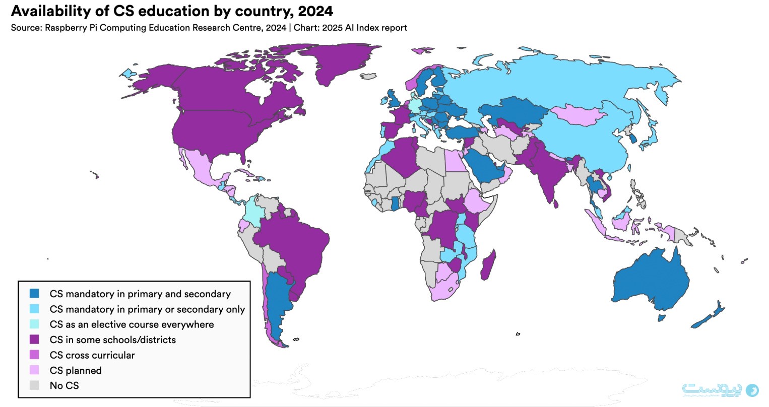 دو سوم کشورها اکنون آموزش علوم کامپیوتر در مقاطع K12 را ارائه میدهند یا برنامهریزی کردهاند رقمی دو برابر سال ۲۰۱۹ که آفریقا و آمریکای لاتین بیشترین پیشرفت را داشتهاند. در ایالات متحده، تعداد فارغالتحصیلان با مدرک کارشناسی در رشتههای کامپیوتر طی ده سال گذشته ۲۲٪ افزایش یافته است. با این حال، در بسیاری از کشورهای آفریقایی به دلیل کمبود زیرساختهای پایه مانند برق، دسترسی محدود باقی مانده است. در ایالات متحده، ۸۱٪ معلمان علوم کامپیوتر K12 معتقدند که هوش مصنوعی باید بخشی از آموزش پایهای باشد، اما کمتر از نیمی از آنها احساس میکنند که مهارت کافی برای تدریس آن دارند.