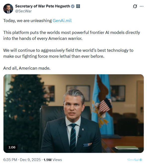 هگست در شبکه اجتماعی ایکس گفت: «این پلتفرم [GenAI.mil] قدرتمندترین مدلهای هوش مصنوعی را در اختیار تمام سربازان آمریکایی میگذارد.»
