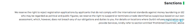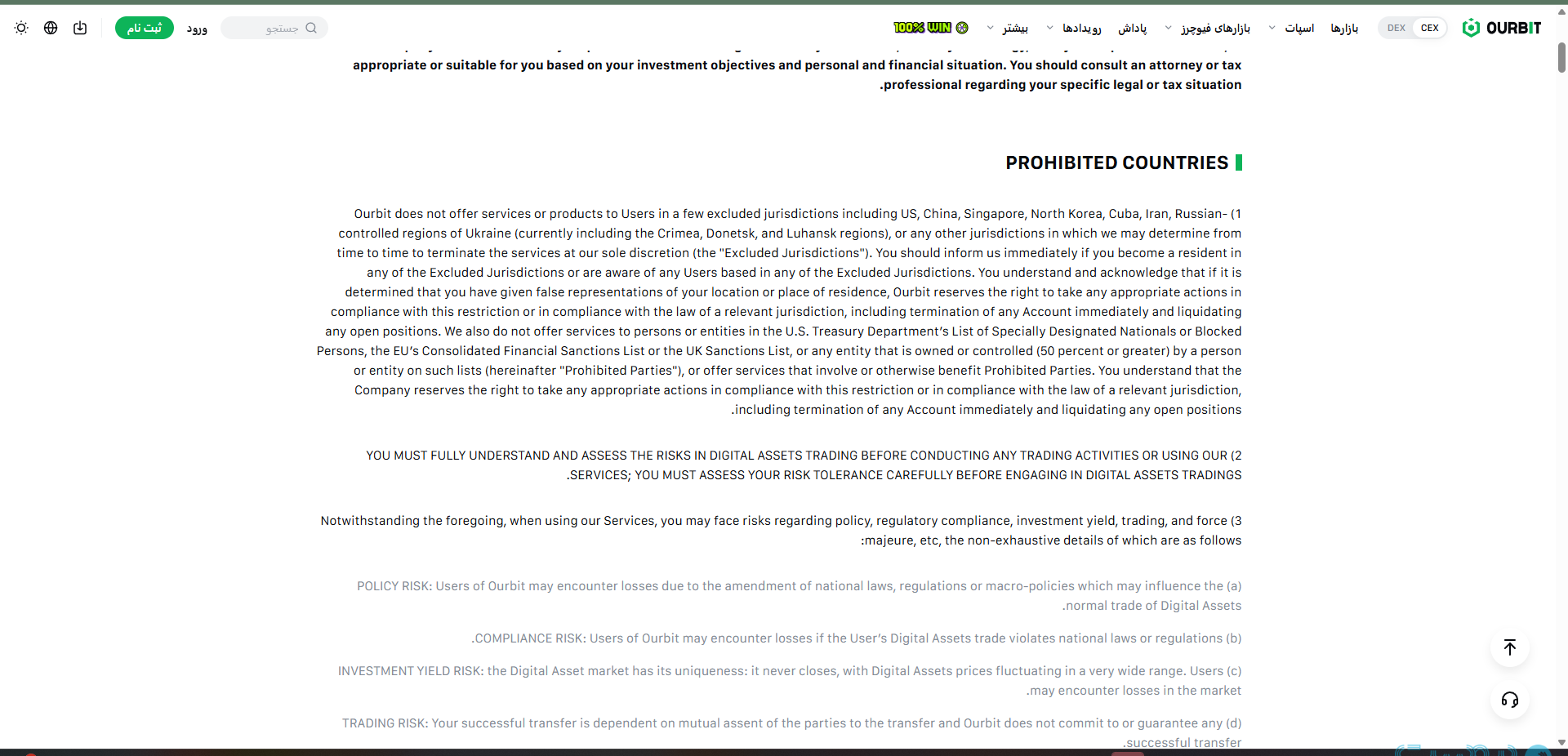همچنین در بخش تحریمهای شرایط استفاده از این صرافی ذکر شده که اوربیت حق دارد «معاملهای که براساس ارزیابی خودش مشکوک تشخیص داده شده را معلق یا لغو کند» و این مساله تعهدات صرافی نسبت به کاربر را نقض نخواهد کرد. صرافی در همین بخش تصریح میکند که برای اطلاعات بیشتر به بخش «کشورهای ممنوعه» مراجعه کنید و در میان کشورهای ممنوع نیز همانطور که گفتیم نام ایران به چشم میخورد.