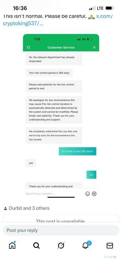 کاربر دیگری با انتشار اسکرین شاتی از مکالمه با پشتیبانی اوربیت میگوید حسابش به تصمیم صرافی به مدت یک سال (۳۶۵) روز قفل شده و امکان برداشت داراییهای خود را ندارد.