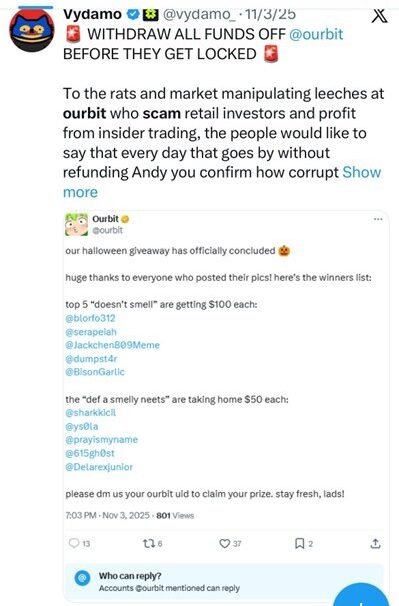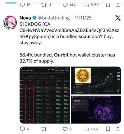 در این بین یکی از کاربران ایکس با نام Nova نیز به احتمال دستکاری بازار در برخی از توکنها اشاره میکند که طبق گفته او درمورد میمکوینی به نام 10KDog، کیف پول داغ صرافی اوربیت به تنهایی ۳۲.۷ درصد از تمام عرضه توکن را در اختیار دارد.