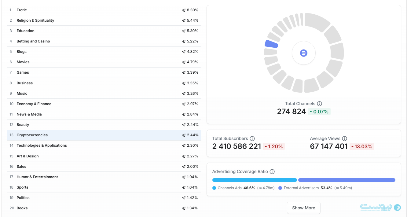 به گزارش پیوست، دادههای وبسایت تلمتریو که یکی از کاملترین دیتابیسهای مربوط به تلگرام در بخشهای مختلف از کانالها است، نشان میدهد که رمزارزها بخش مهمی از محتوای این پلتفرم هستند و در سطح جهانی حتی بالاتر از فناوری و اپلیکیشنها، ورزش یا سیاست در جایگاه سیزدهم از لحاظ مجموع مخاطب کانالها قرار دارند (جایگاه نخست نیز در اختیار کانالهای با محتوای اروتیک است.)
