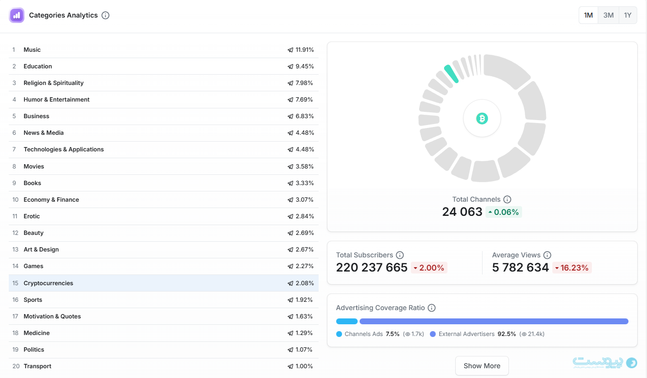 طبق آمار تلمتریو، کانالهای رمزارزی به طور کلی با وجود ریزش بازدید، به طور میانگین در هر ماه بیش از ۶۷ میلیون بازدید دارند و اگر نگاهی به تفکیک کشورها بیاندازیم میبینم که رمزارز در ایران نیز جایگاه پانزدهم را با بیش از ۵.۷ میلیون بازدید در ماه در اختیار دارد.