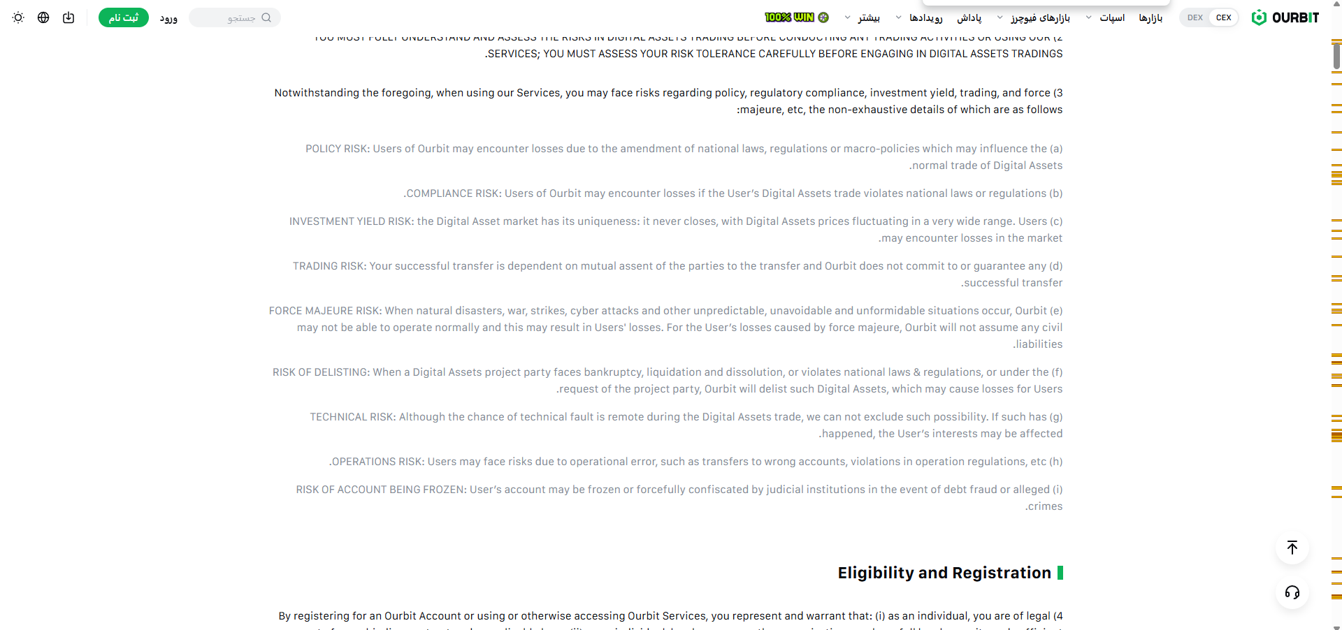 این در حالی است که در بخش شرایط استفاده (که تنها به زبان انگلیسی منتشر شده است) صرافی ذکر شده که اوربیت از «پیروی از مقررات و قوانین مشتری خود را بشناس و ضد پولشویی اطمینان حاصل میکند» و دانسته این مقررات را نقض نخواهد کرد.