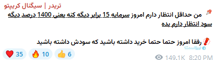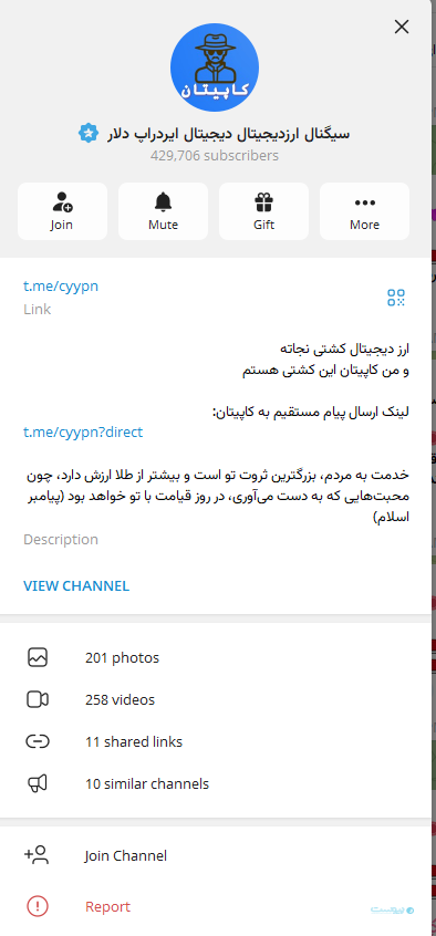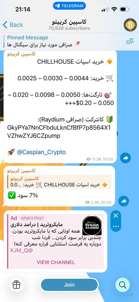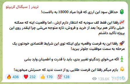 محتوای این کانال پرمخاطب اما به وضوح فریبنده است و چیزهایی مثل سودهای برابری و فروش توکنهای میمکوین در وبسایتی گمنام محتوای اصلی این کانال تلگرامی است.