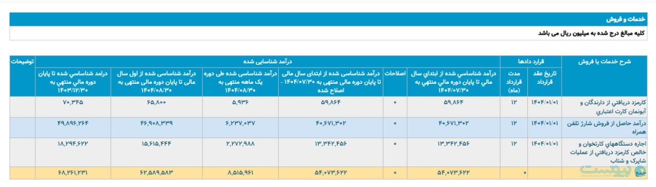 درآمد این شرکت در این بازه زمانی از محل کارمزد دریافت از دارندگان و آبونمان کارت اعتباری بیش از ۵۹۳ میلیون تومان عنوان شد.