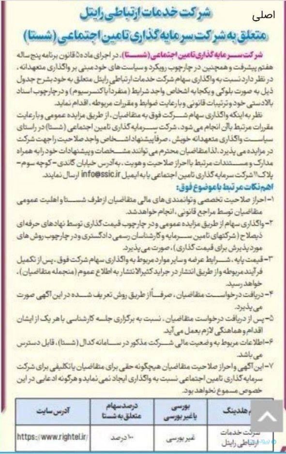 بهگزارش پیوست، شستا در اجرای ماده ۵ قانون برنامه پنج ساله هفتم پیشرفت و همچنین در چارچوب رویکرد و سیاستهای خود مبنی بر واگذاری متعهدانه در نظر دارد سهام شرکت خدمات ارتباطی رایتل را از طریق مزایده بفروشد.