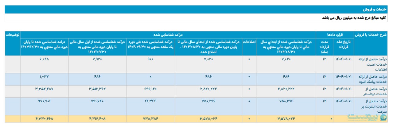 طبق صورتمالی منتشر شده از سمت افرانت روی سامانه کدال، این شرکت در آذرماه از بخش ارائه خدمات اینترنت پرسرعت بیش از ۴ میلیارد تومان درآمد بهثبت رسانده است.