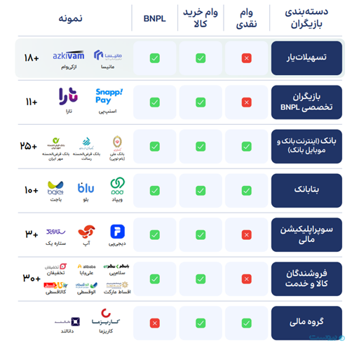 در این گزارش مانیسا، دیجیپی، ازکیوام، تارا، اسنپپی، جیاسامپی، دیجیشهر، تکنوپی، ونسی، بالون، نسیبا، مثبت هفت در دسته لندتکها جای داده شده و کارت خرید کالا لندو و قسطا به عنوان کارتهای اعتباری آورده شده است.(۹ بازیگر اول بر اساس مبلغ وام اعطایی و مابقی بر اساس رتبه نتایج جستجوی گوگل و ترافیک سایت به ترتیب نزولی جای گذاری شدهاند. وام آنلاین توسط بتابانکها و سوپراپلیکیشن های مالی نیز ارائه میشود.)