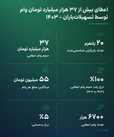 همین گزارش نشان میدهد تقریبا ۲۰ پلتفرم تسهیلاتیار در کشور شناسایی شدهاند که تا کنون بیش از ۶۷۰ هزار وام و در مجموع ۳۷ هزار میلیارد تومان وام اعطا کردهاند و نرخ رشد حجم وام اعطایی از سال ۱۴۰۳ به سال ۱۴۰۴ به میزان صد درصد رشد کرده و میانگین مبلغ وامهای اعطایی آنها ۵۵ میلیون تومان بوده است.