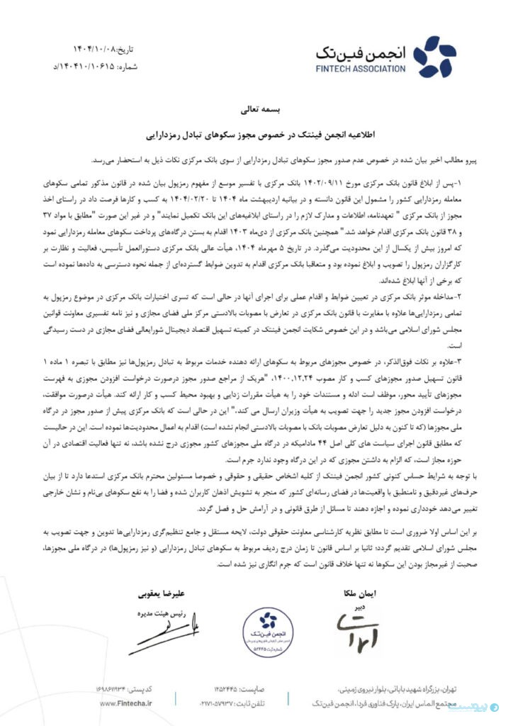 در بخش دیگری از این بیانیه آمده است که مطابق قانون تسهیل صدور مجوزهای کسبوکار، تمامی مجوزهای فعالیت اقتصادی باید از مسیر درگاه ملی مجوزها صادر شود و هرگونه شرطگذاری یا اخذ تعهدنامه خارج از این مسیر، فاقد وجاهت قانونی است. به تاکید انجمن فینتک، تا زمانی که فعالیتی در این درگاه غیرمجاز اعلام نشده باشد، اطلاق عنوان فعالیت غیرمجاز به سکوهای تبادل رمزارز، مبنای حقوقی ندارد و علاوهبر خلاف قانون بودن، جرمانگاری نیز شده است.
