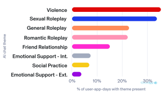 از ۱۳ سالگی به بعد، نقشآفرینیهای عاشقانه و جنسی بیشترین سهم را دارند و حدود ۶۳ درصد از مکالمات را شامل میشوند، اما این علاقه پس از ۱۵ سالگی کاهش مییابد. در سن ۱۶ سالگی، نزدیک به یکپنجم گفتوگوها به سمت دریافت حمایت عاطفی از هوش مصنوعی سوق پیدا میکنند.