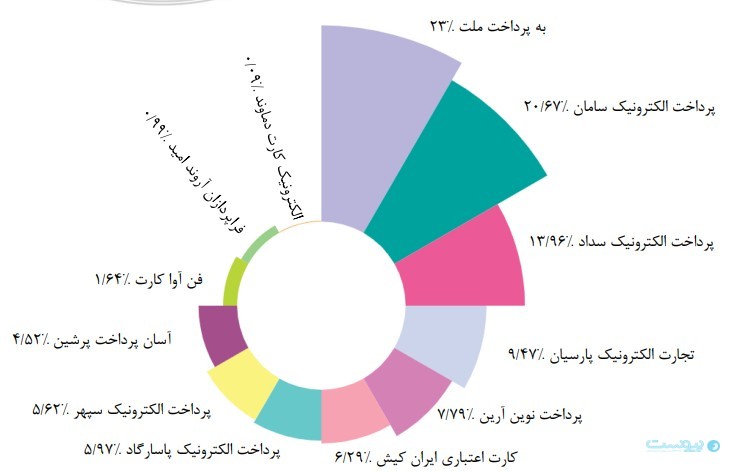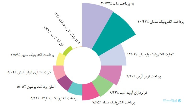 شرکت «پرداخت الکترونیک سامان» در آذر ماه با پوشش ۲۰.۲۵ درصد از بازار تراکنشهای کارتخوان فروشگاهی بالاترین سهم را در اختیار خود دارد. شرکت «به پرداخت ملت» نیز در هر دو ابزار پذیرش اینترنتی و کدهای دستوری (USSD) به ترتیب با کسب ۴۵.۷۶ و ۴۶.۱۱ درصد از سهم بازار دارنده بالاترین سهم در بازار است. همچنین شرکت «آسان پرداخت پرشین» با پوشش ۹۸.۴۷ درصد از بازار تراکنشهای موبایلی بالاترین سهم را در اختیار خود دارد.