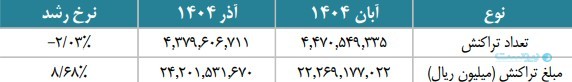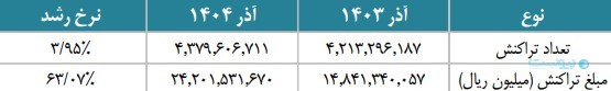 طبق جداول منتشر شده در آذر ۱۴۰۴ رشد ۶۳.۰۷ درصدی در ارزش اسمی تراکنشها در قیاس نقطه به نقطه اتفاق افتاده است. همچنین رشد حقیقی ارزش تراکنشها بدون در نظر گرفتن اثرات تورم محاسبه شده ۶.۸۵ درصد است.