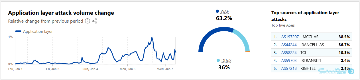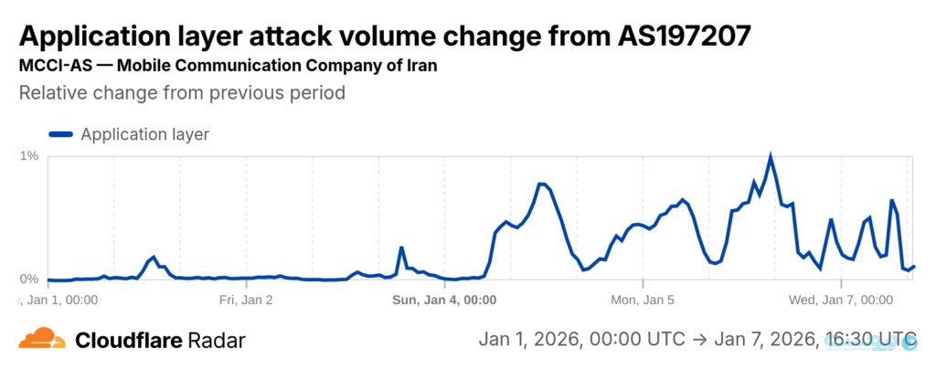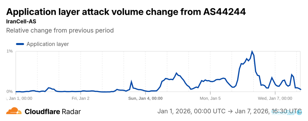 به گزارش پیوست، بر اساس پایش کلادفلر سطح حملاتی که از مبدا ایران نسبت به سایر نقاط انجام میشود طی چهار هفته گذشته نسبتاً پایدار بوده، اما در بازهٔ یکشنبه تا چهارشنبه (۱۴ تا ۱۷ دی) بهطور ناگهانی بین دو تا سه برابر سطح معمول افزایش یافته است. این رویداد، برخلاف روندهای تدریجی و قابل پیشبینی در کشورهای دیگر، حاکی از حساسیت فضای سایبری ایران به رویدادهای بیرونی و نوسانات اجتماعی است.
