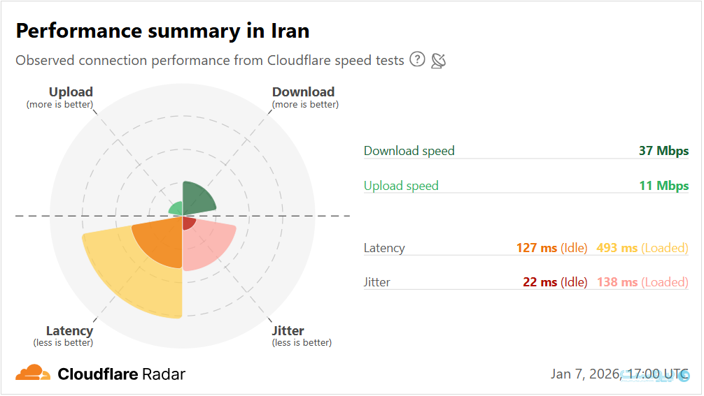 نمودارهای زمانی کلادفلر همچنین از بیثباتی شدید حکایت میکنند. جایی که سرعت، تأخیر و پاسخ DNS بهطور مداوم دچار نوسانهای تند و غیرقابل پیشبینی میشوند. این وضعیت نشاندهنده زیرساختی شکننده و کمظرفیت است که کیفیت خدمات در آن درگیر نوسانات روزمره و ساعتی است. در بستر سیاسی و ژئوپولیتیکی ایران، چنین ناپایداری تنها نشانه کمبود سرمایهگذاری نیست، بلکه میتواند ابزاری برای اعمال «اختلال نرم» در ارتباطات بدون قطع کامل اینترنت باشد.