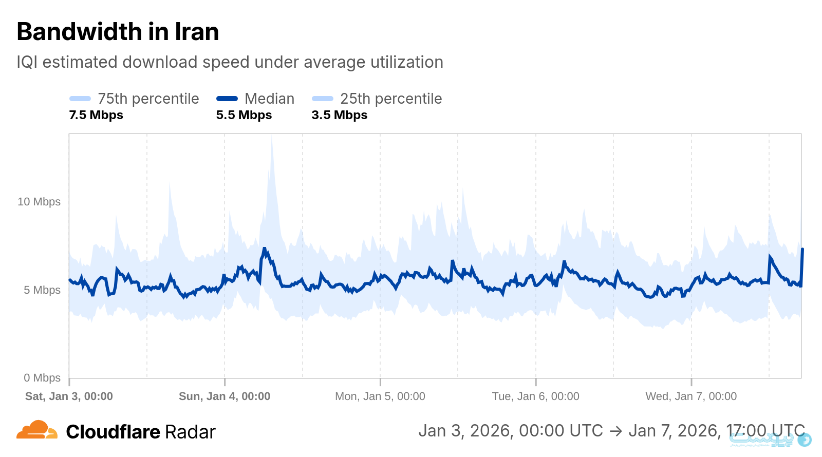 دادههای کلاودفلر تصویری از اینترنتی با سرعت بسیار پایین ارائه میدهد. سرعت دانلود نیمی از کاربران ایرانی تنها ۵.۴ مگابیت بر ثانیه است و یکچهارم کاربران سرعتی برابر یا کمتر از ۳.۵ مگابیت بر ثانیه را تجربه میکنند. هرچند میانگین نتایج تست سرعت در بازه ۹۰روزه عدد بالاتری را نشان میدهد، اما تجربه واقعی و روزمره کاربران، بیانگر اینترنتی کند و محدود است. این ارقام فاصله معناداری با میانگینهای جهانی با پهنایباند ۳۰ تا ۵۰ مگابیت و تأخیر کمتر از ۱۰۰ میلیثانیه دارند.
