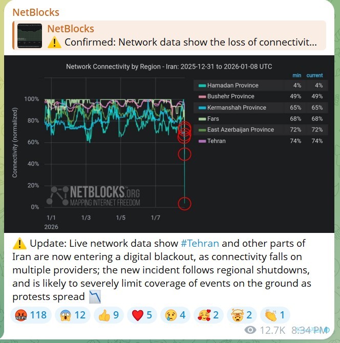 دادههای زنده اتصال شبکه نتبلاکس نشان دهنده افت همزمان اینترنت در تهران و چندین استان دیگر ایران است. این نهاد پایش اینترنت اعلام کرده است که کاهش اتصال در چند ارائهدهنده بهطور موازی رخ داده و نشانههایی از ورود کشور به یک «خاموشی دیجیتال» مشاهده میشود.