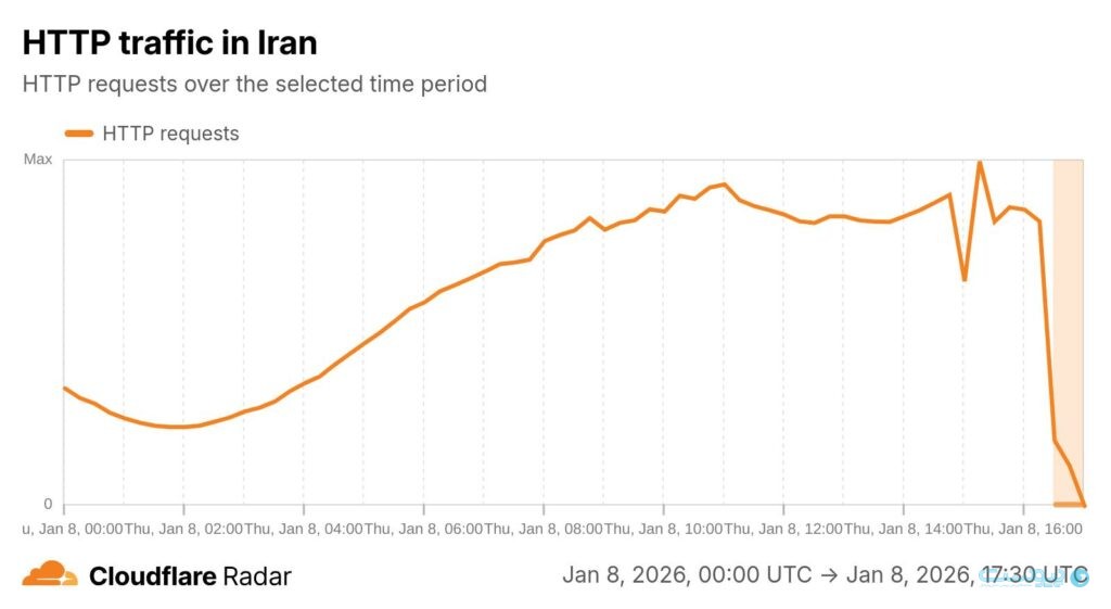 کاهش ناگهانی ترافیک اینترنت ایران در دادههای کلادفلربررسی نمودار «ترافیک HTTP در ایران» منتشرشده توسط Cloudflare Radar نشان میدهد که در روز پنجشنبه ۱۸ دی ۱۴۰۴، الگوی ترافیک اینترنت کشور تا ساعات میانی روز روندی نسبتاً باثبات و رو به افزایش داشته، اما در ساعات پایانی بازه زمانی ثبتشده، افتی شدید و ناگهانی را تجربه کرده است.