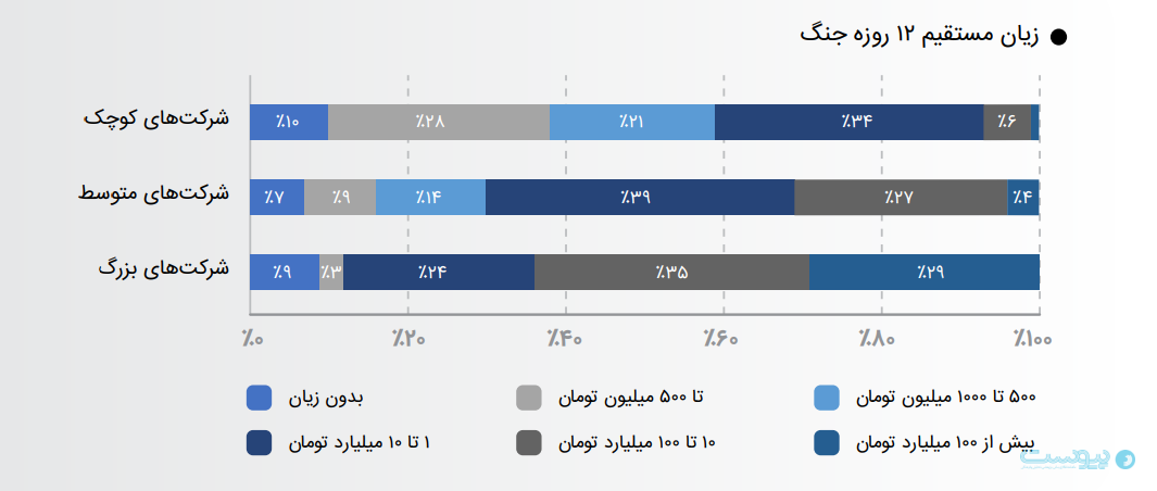 زیان مستقیم ناشی از هزینه توقف، خسارت فیزیکی و جابجایی در مدت ۱۲ روز جنگ نیز چشـمگیر بوده اسـت. به طوری که ۴۱ درصد از کسبوکارهای کوچک متحمل بیش از ۱ میلیارد تومان، ۳۱ درصد از کسب وکارهای متوسط متحمل بیش از ۱۰ میلیارد تومان و ۲۹ درصد از کسـب وکارهای بـزرگ متحمـل بیـش از ۱۰۰ میلیـارد تومان ضرر شدهاند.