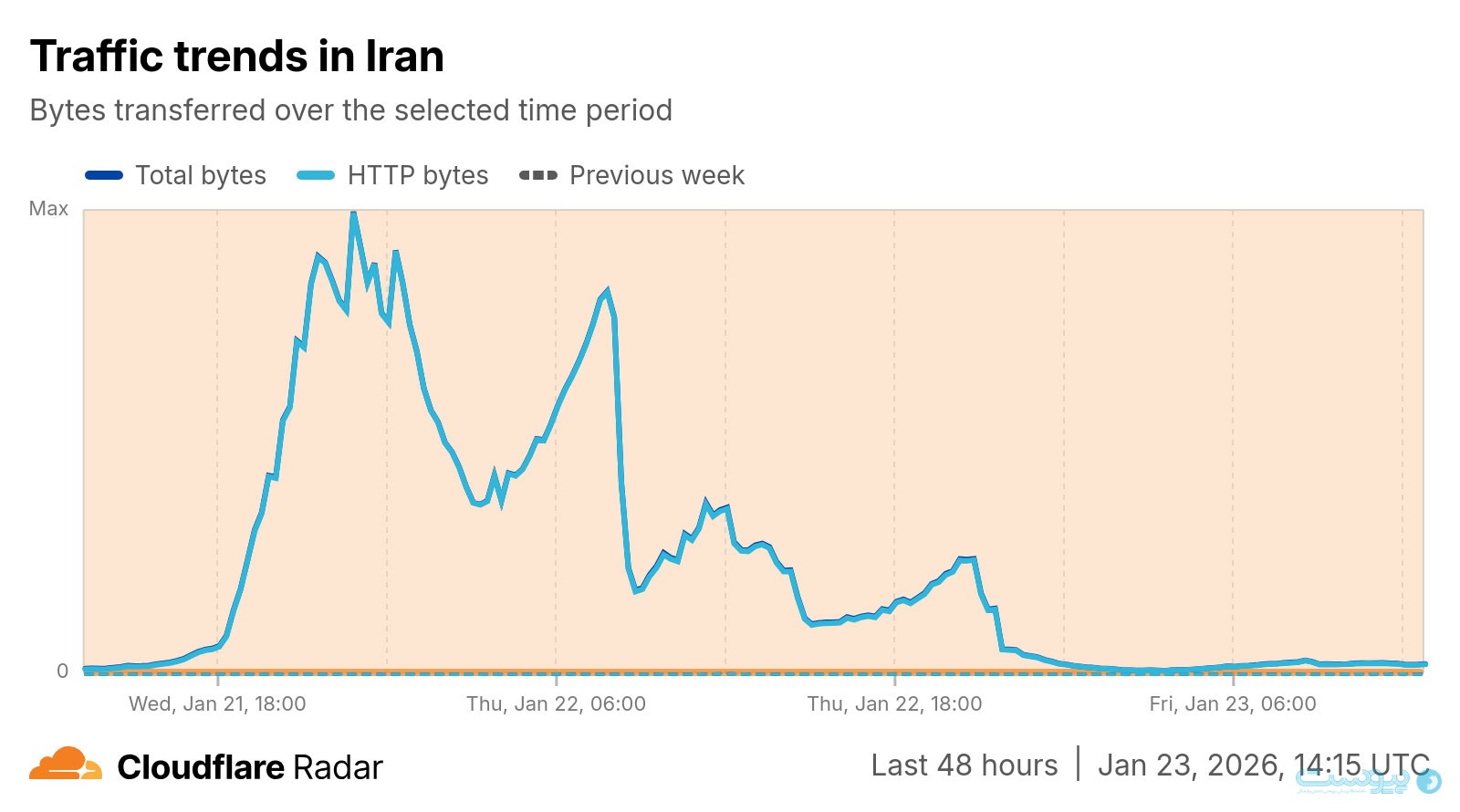 دادههای منتشرشده از سوی کلاودفلر، تصویری عددی از این ناپایداری ارائه میدهد. طبق این دادهها، از بامداد پنجشنبه حدود ۳۰ درصد از پهنای باند اینترنت کشور نسبت به وضعیت پیش از قطعی فعال شده، اما این میزان در ساعات صبح پنجشنبه با افتی جدی مواجه شد.