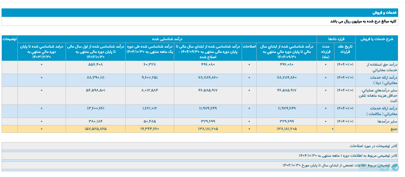 طبق صورتمالی منتشر شده از سمت مخابرات روی سامانه کدال، این شرکت از بخش ارائه خدمات مخابراتی(مکالمه) در دیماه ۱۴۰۴ بیش از ۱۶۲ میلیارد و ۱۰۰ میلیون تومان درآمد بهثبت رساند.