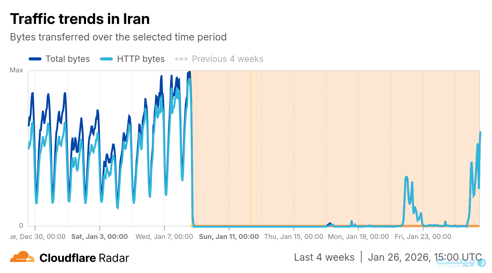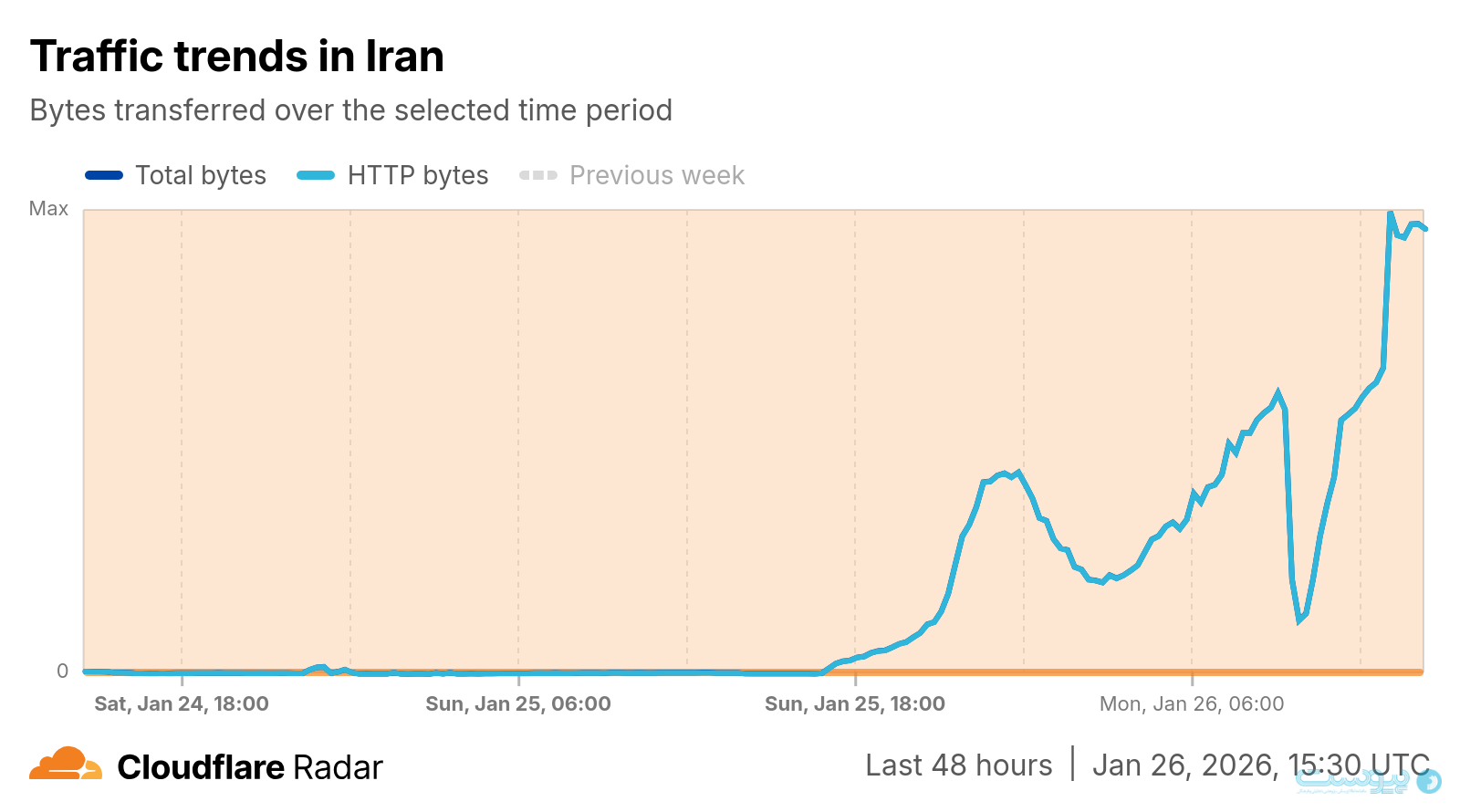 این نمودار ۴۸ ساعت گذشته نشان میدهد که ترافیک اینترنت ایران از وضعیت نزدیک به صفر خارج شده و بهصورت پیوسته در حال افزایش است، بهطوریکه بنا بر برآورد، به حدود ۵۳ درصد ظرفیت پیش از خاموشی گسترده در هجدهم دیماه رسیده است.اما بازگشت پهنای باند الزاماً به معنای بازگشایی دسترسی مردم نیست و احتمالاً بخش قابلتوجهی از این ترافیک به ارتباطات زیرساختی، سازمانی یا دسترسیهای کنترلشده اختصاص دارد موضوعی که شک نمودار نیز آن را تائید میکند زیرا فاقد نوسانهای طبیعی شبانهروزی است.