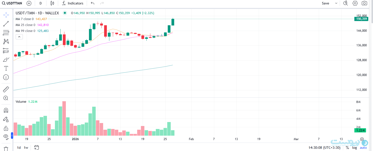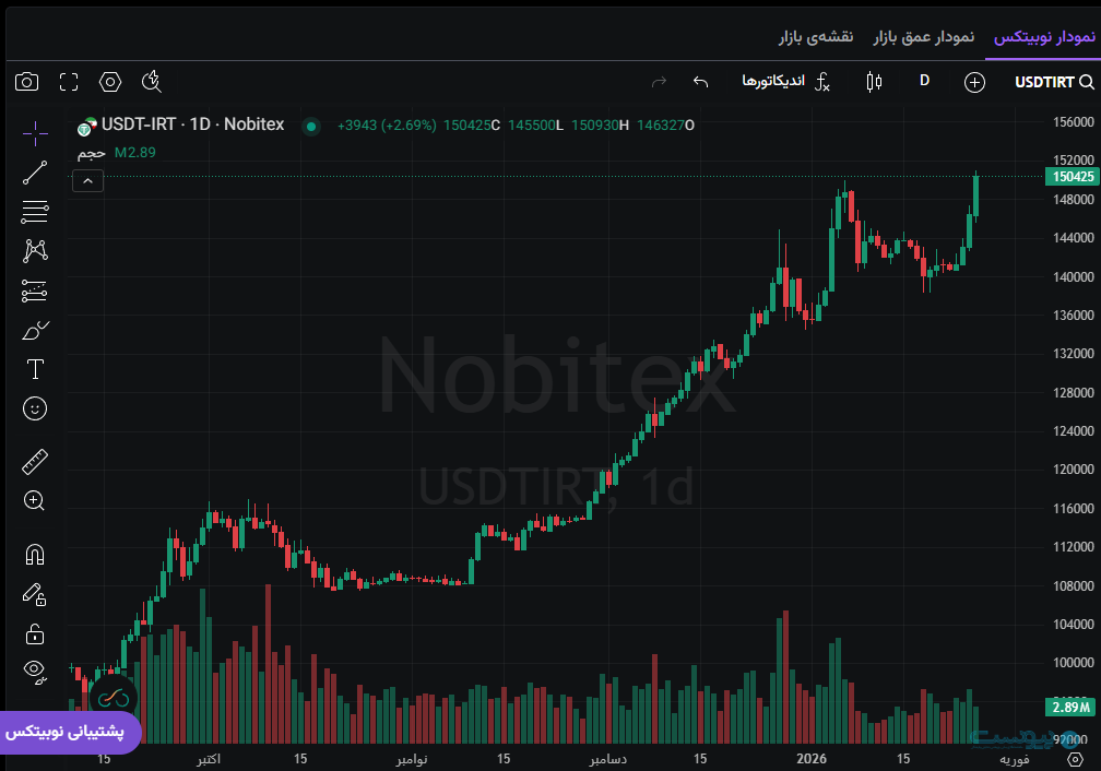 به گزارش پیوست، بعد از حدود ۱۵ روز که نرخ تتر در صرافیهای رمزارزی در بازه ۱۴۰ تا ۱۴۴ تومان در نوسان بود، امروز ۷ بهمن قیمت هر واحد تتر از ۱۵۰ هزار تومان عبور و رکورد جدیدی ثبت کرد.