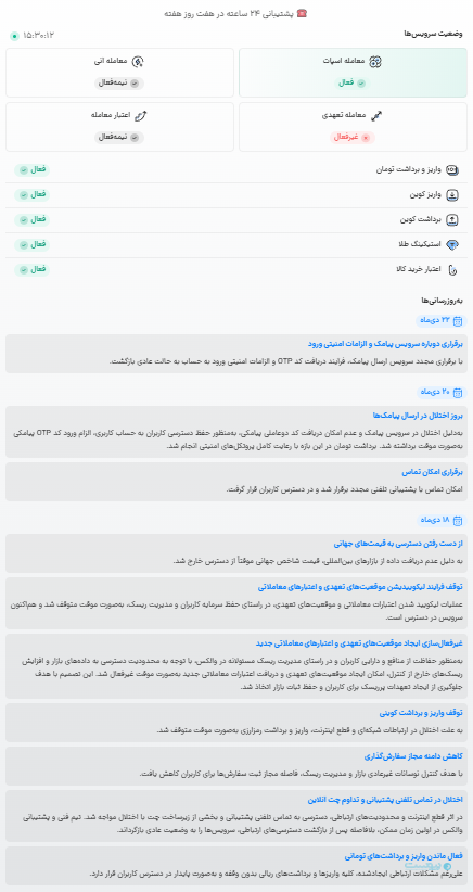 دادههای این صفحه نشان میدهد، از ۱۸ دیماه بجز فعال ماندن واریز و برداشتهای تومانی، دیگر بخشهای این پلتفرم که وابستگی به اینترنت داشتهاند مانند دسترسی به قیمت جهانی، معاملات تعهدی، واریز و برداشت رمزارز و حتی پشتیبانی متوقف، غیرفعال یا با اختلال مواجه شدهاند.