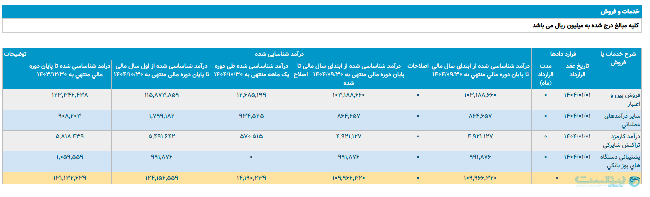 در این رابطه در صورتمالی دیماه آپ آمده است: با توجه به اینکه شناسایی درآمدهای پشتیبانی بانکی جهت آذر ماه ۱۴۰۴ در دست اقدام بوده و مبنای جدید مورد توافق (عقد قرارداد با ضرائب جدید) در دست بررسی و تاییدست، اطلاعات مربوط به ماه ۱۰ ارائه نشده و به محض تعیین و تکلیف در اطلاعات ماهانه ماه بعد ارائه میشود.