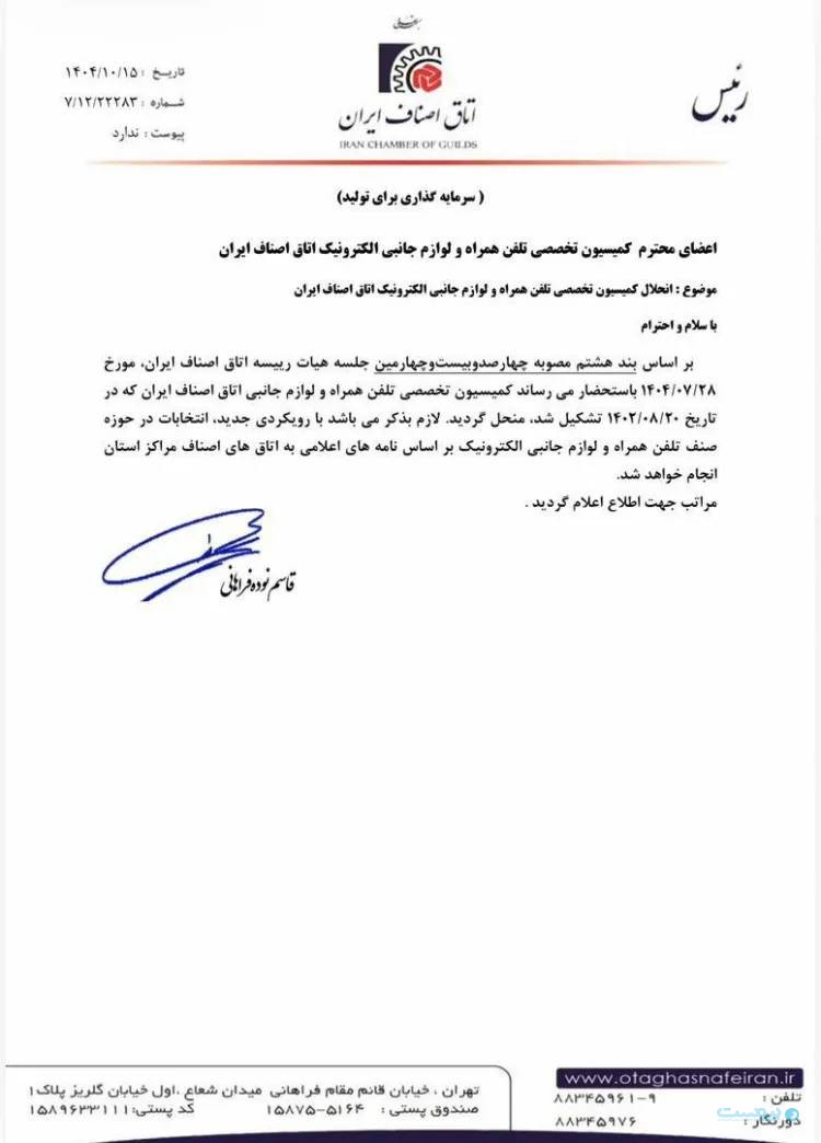 قاسم نوده فراهانی، رئیس اتاق اصناف ایران در این ابلاغیه گفته است که قرار است بهزودی و بر اساس اطلاعرسانی قبلی به رؤسای اتاق اصناف مراکز استانها، انتخابات جدیدی برای تشکیل مجدد این کمیسیون برگزار شود.