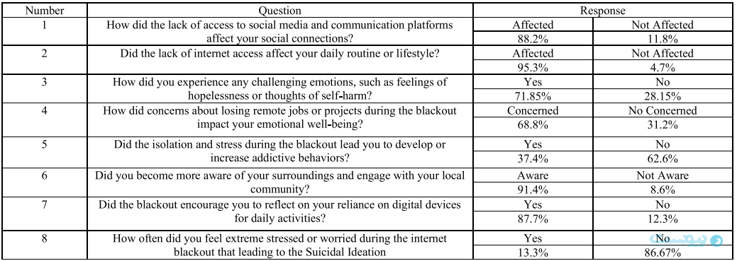 همچنین ۹۵.۳ درصد پاسخ دهندگان اعلام کردهاند که نداشتن دسترسی به اینترنت بر سبک و روتین زندگی روزمره آنها تاثیر گذاشته است.