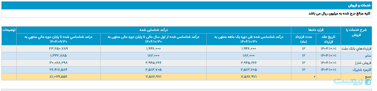 قراردادهای بانک ملت نیز برای این شرکت در این بازه زمانی ۱۹۴ میلیارد و ۶۰۰ میلیون تومان درآمد بههمراه داشت. درآمد این بخش در ماه گذشته از مرز ۲۰ میلیارد تومان عبور کرد.