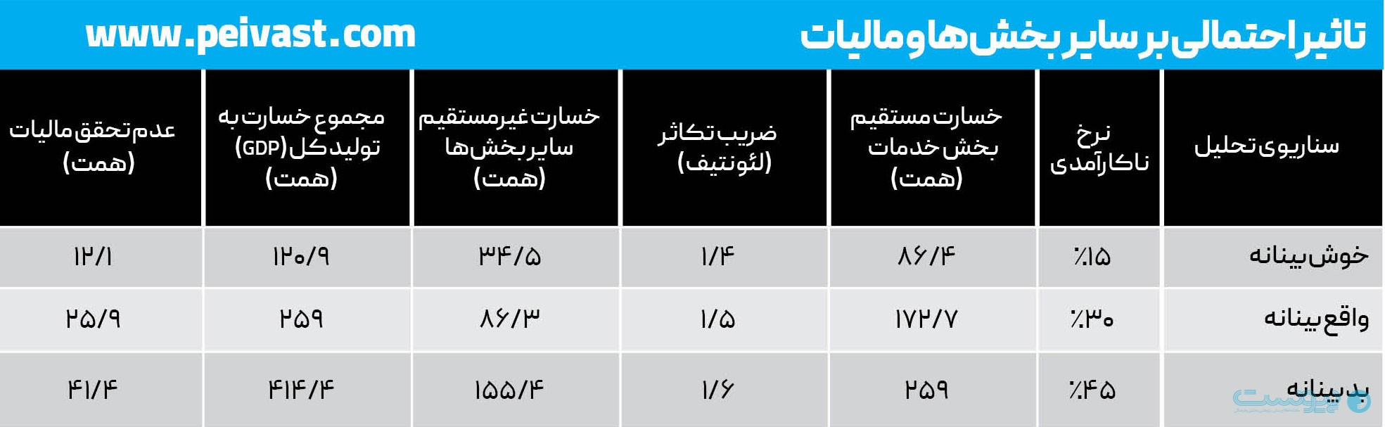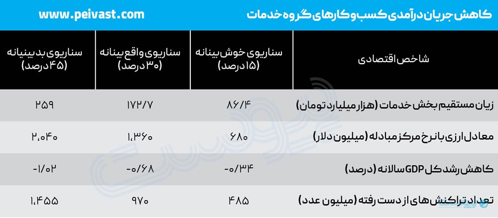 در نهایت، سناریوی بدبینانه که مبنای آن ناکارآمدی ۴۵ درصدی است، حکایت از افت ۲۵۹ همتی درآمدها دارد که فشار آن به صورت ریزش روزانه ۱۲.۹ همت بر بدنه بخش خدمات سنگینی میکند.