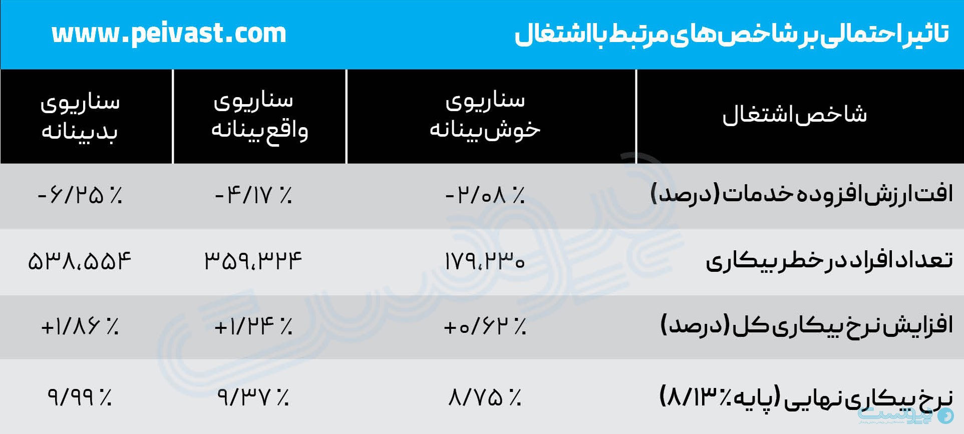 برای برآورد اثر بر اشتغال، از ضریب کشش اشتغال نسبت به سرمایه استفاده شده است. این ضریب در بخش خدمات حدود ۰.۶۵ برآورد میشود؛ به این معنا که هر یک درصد کاهش در تولید این بخش، به کاهش ۰.۶۵ درصدی تقاضای نیروی کار منجر میشود. با توجه به اینکه شاغلان بخش خدمات ۵۳.۱ درصد کل جمعیت شاغل بالای ۱۵ سال را تشکیل میدهند و تعداد آنها حدود ۱۳.۲ میلیون نفر است، ابعاد این شوک اشتغالی قابل توجه است.
