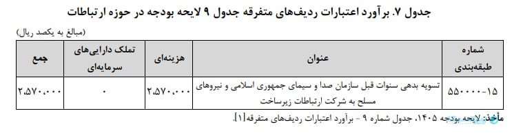در لایحه بودجه یک ردیف با عنوان تسویه بدهی سنوات قبل سازمان صدا و سیمای جمهوری اسلامی و نیروهای مسلح به شرکت ارتباطات زیرساخت ایجاد شده است. مبلغ این بدهی ۲۵۷ میلیارد تومان پیشبینی شده است.