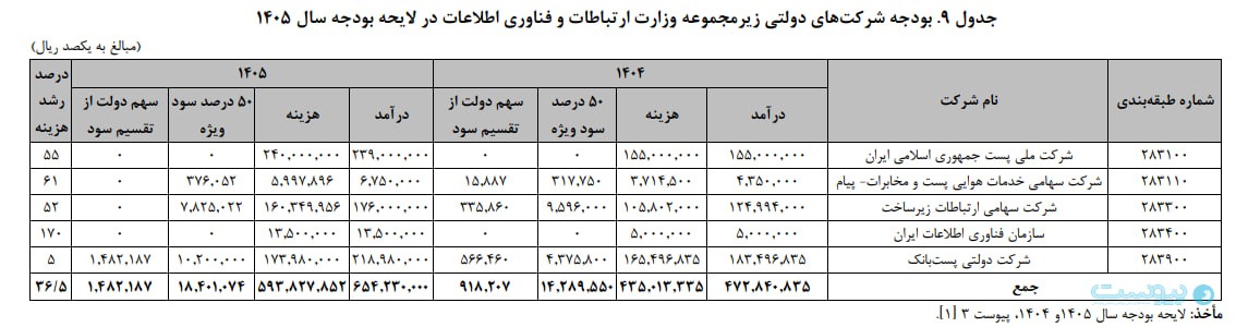 کل اعتبارات وزارت ارتباطات و و شرکتهای تابعه آن (۵ شرکت شامل: شرکت زیرساخت، سازمان فناوری اطلاعات، پستبانک، شرکت ملی پست، پیام) بالغبر ۱۱۲ هزار میلیارد تومان است. از این مبلغ حدود ۸۲ هزار میلیارد تومان اعتبارات شرکتهای تابعه وزارت ارتباطات و فناوری اطلاعات (۷۳ درصد از جممع کل) و حدود ۳۰ هزار میلیارد تومان اعتبارات وزارتخانه مذکور و سازمانهای تابعه آن (۲۷ درصد از جمع کل) خواهد بود. کنترل هزینههای ۵ شرکت تابعه وزارت ارتباطات، توسط وزارتخانه مذکور ضروری به نظر میرسد.