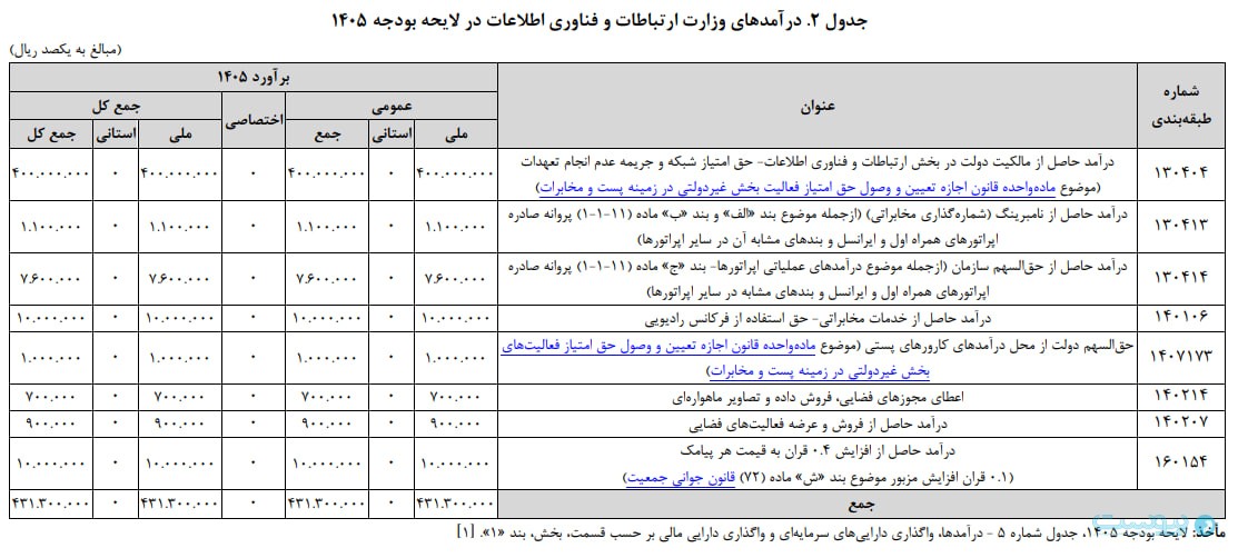 کل اعتبارات وزارت ارتباطات و فناوری اطلاعات و شرکتهای تابعه آن بالغ بر ۱۱۲ هزار میلیارد تومان است. از این مبلغ حدود ۸۲ هزار میلیارد تومان اعتبارات شرکتهای تابعه وزارت ارتباطات و فناوری اطلاعات و حدود ۳۰ هزار میلیارد تومان اعتبارات وزارتخانه مذکور و سازمانهای تابعه آن خواهد بود. بیشتر اعتبارات وزارت ارتباطات و فناوری اطلاعات و شرکتهای تابعه آن در برنامه توسعه شبکه ملی اطلاعات متمرکز است. این برنامه اعتباری حدود ۷۶ هزار میلیارد تومان را در سال ۱۴۰۵ خواهد داشت که حدود ۵۵ هزار میلیارد تومان از آن توسط شرکتهای تابعه وزارت ارتباطات و فناوری اطلاعات هزینه خواهد شد.