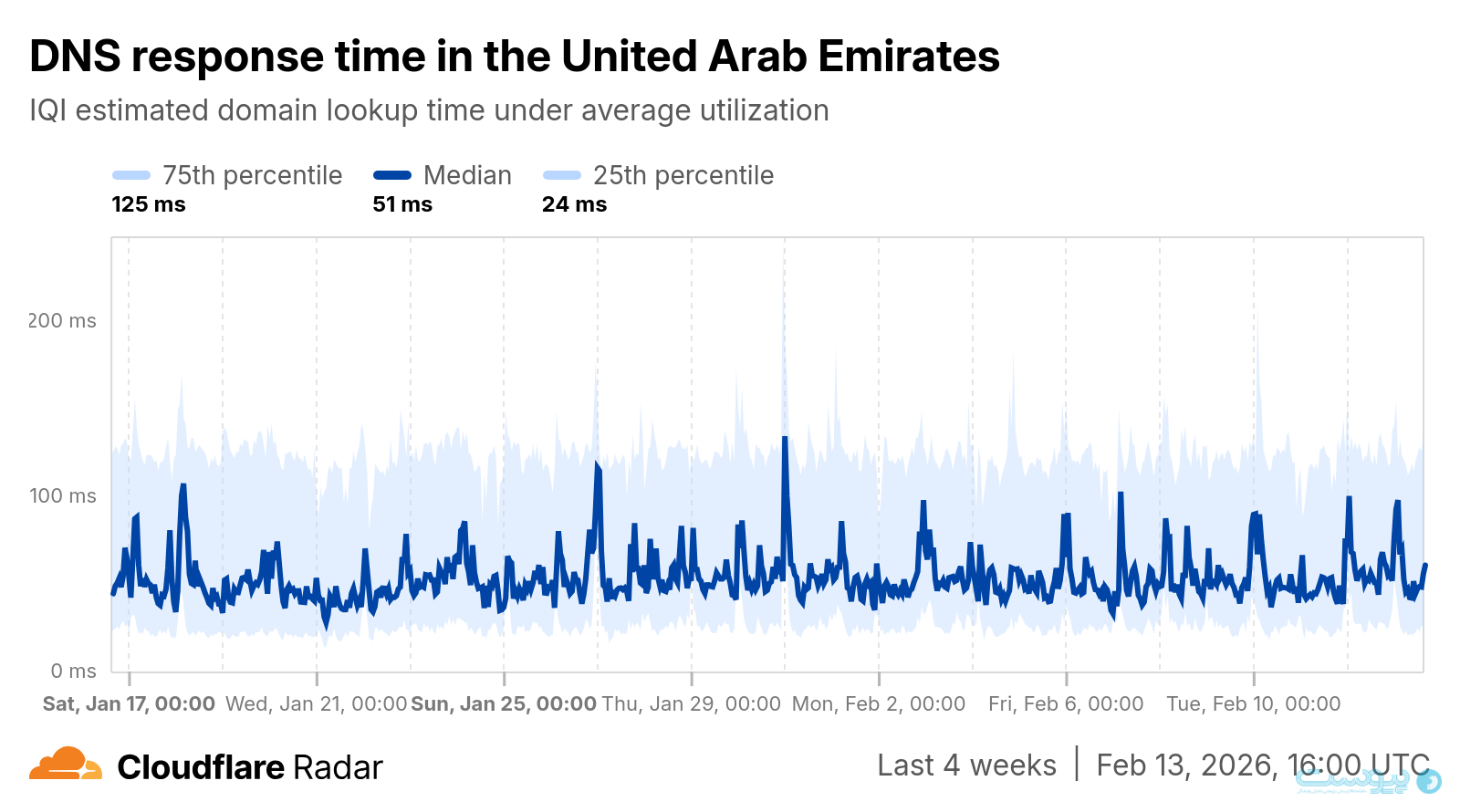 در شاخص زمان پاسخدهی سیستم نام دامنه (DNS)، شبکه امارات رفتاری کاملاً هموار و پیشبینیپذیر با میانه ۵۴ میلیثانیه دارد که نشاندهنده نبودِ مانع پردازشی در مسیر درخواستها است. در مقابل، شبکه ایران نه تنها میانهای حدود ۱۳۸ میلیثانیه را ثبت کرده، بلکه دچار جهشهای ضربانی تا بالای ۳۰۰ میلیثانیه است. این نوسان شدید در ایران، در حالی که امارات نوسانی نزدیک به صفر دارد، ثابت میکند که درخواستهای کاربران ایرانی در لایههای میانی شبکه (احتمالا برای بازرسی توسط DPI) متوقف میشوند.