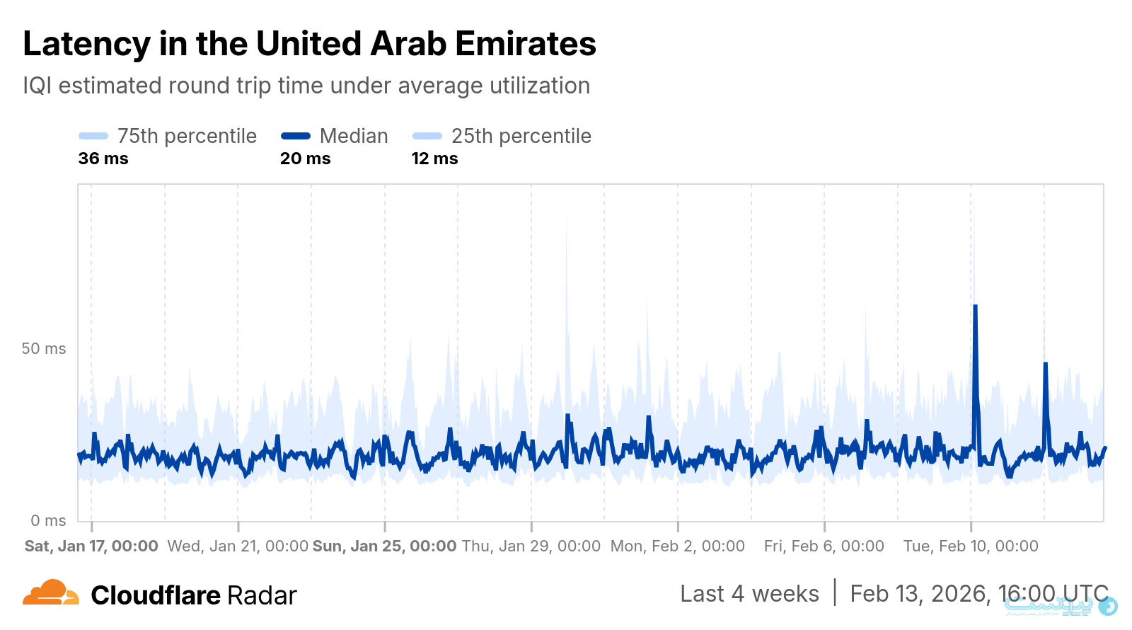 تحلیل مقایسهای میان شبکه ایران و امارات متحده عربی در بازه ۷ روزه گذشته شواهد فنی را برای اثبات مهندسی ترافیک در ایران فراهم میکند. خصوصا اینکه هر دو کشور از نظر جغرافیایی به کابلهای زیردریایی و تأمینکنندگان پهنای باند مشابهی در منطقه خلیج فارس وابستهاند، اما خروجی کیفیت اینترنت آنها در تضاد کامل است.