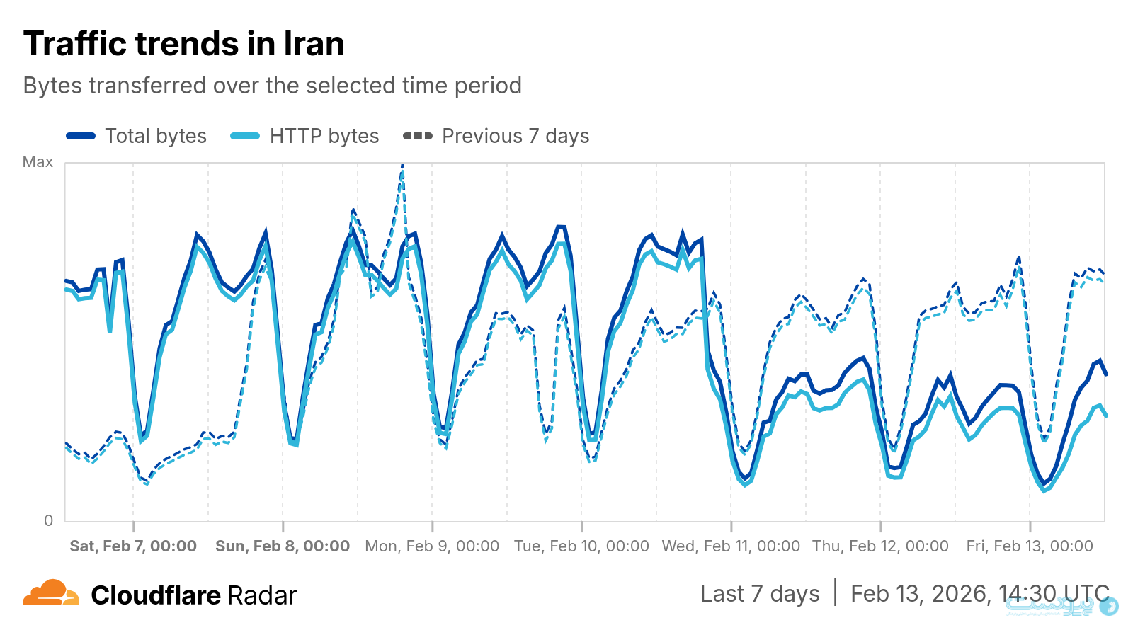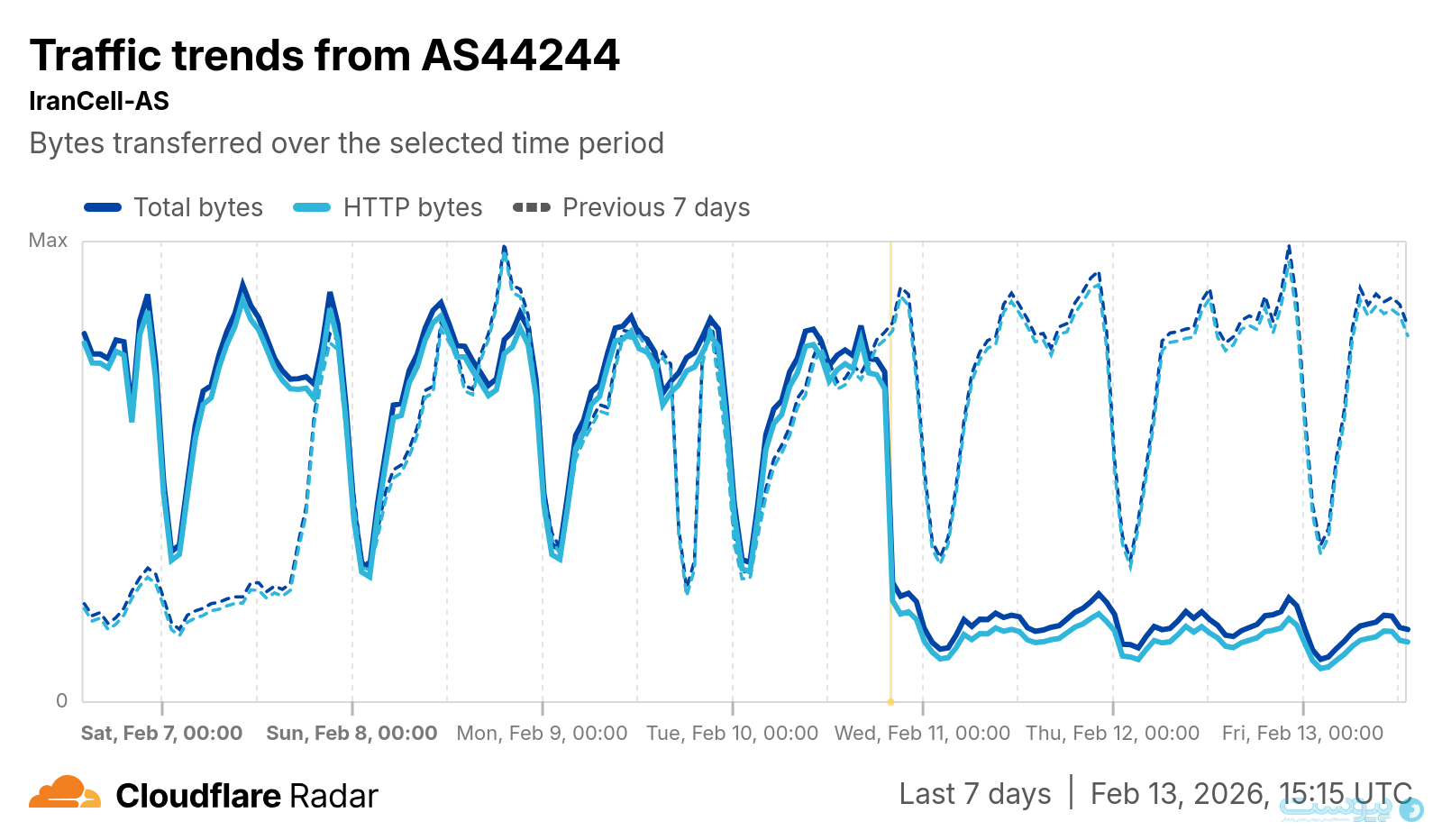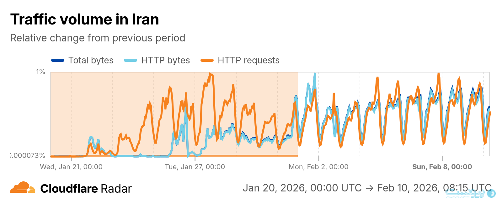 از روز ۲۲ بهمن حجم پهنای باند اینترنت کشور بر اساس دادههای کلاودفلر حدود ۴۰ تا ۶۰ درصد افت کرده ولی این افت در همه اپراتورها یکسان نیست. پیش از این اغلب اختلالها روی پروتکلها و سرویسها رخ میداد اما اکنون شاهد یک اختلال عمده در ترافیک هستیم.