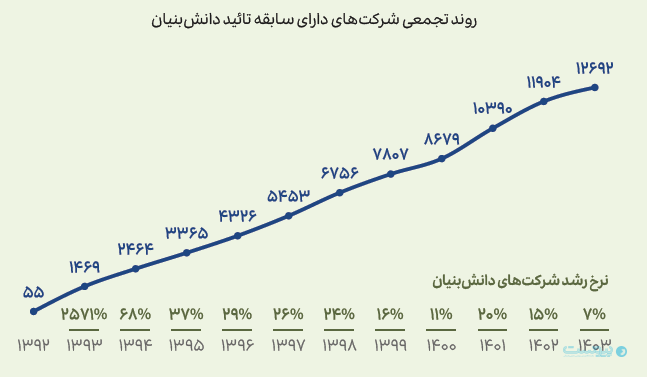 تا پایان سال ۱۴۰۳ تعداد شرکتهای دانشبنیان فعال به ۱۰ هزار و ۱۰۸ شرکت رسیده است. در این سال ۷۸۹ شرکت جدید موفق به دریافت تاییدیه دانشبنیان شدهاند و در مقابل، ۳۹۹ شرکت نیز از این فهرست خارج شدهاند. در مجموع تاکنون ۱۲ و هزار و ۶۹۲ شرکت حداقل یک بار تاییدیه دانشبنیان دریافت کردهاند. با این حال نرخ رشد شرکتهای دانشبنیان در سال ۱۴۰۳ به ۷ درصد کاهش یافته که پایینترین میزان رشد در ۱۰ سال گذشته محسوب میشود. این موضوع نشان میدهد سرعت ورود شرکتهای جدید به زیستبوم فناوری نسبت به سالهای قبل کمتر شده است.