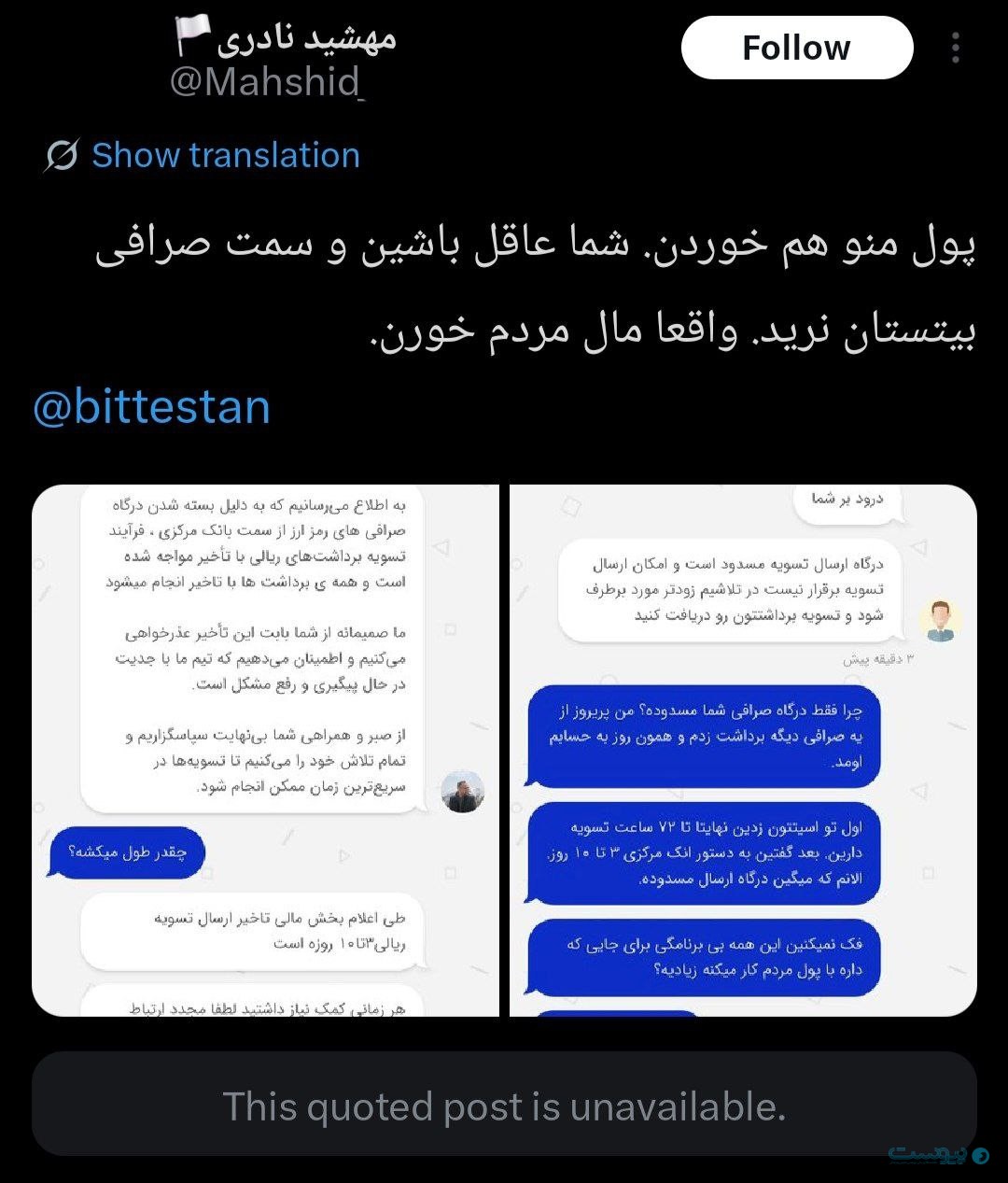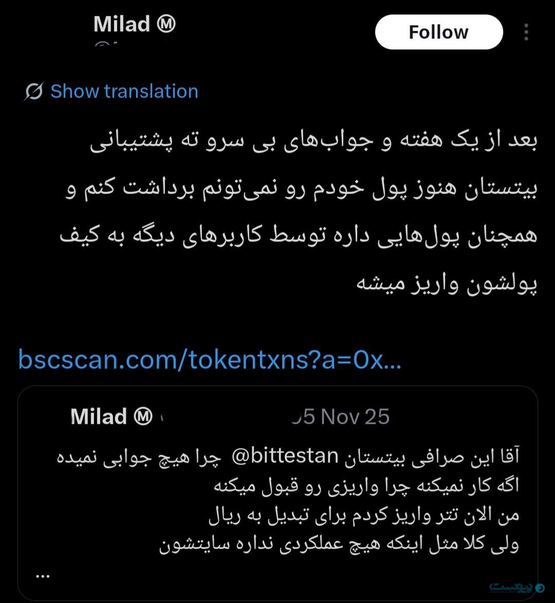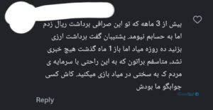 بیتستان یکی از این صرافیها است که نشانههای بروز مشکل در تسویه حساب کاربران آن، از ماههای پایانی سال ۱۴۰۳ پررنگتر شده و پس از جنگ به اوج رسیده است. مرور کامنتهای کاربران در اینستاگرام و نوشتههای منتشرشده در شبکه اجتماعی ایکس (توییتر سابق) نشان میدهد شمار قابل توجهی از مشتریان این صرافی از عدم امکان برداشت یا تاخیر طولانی در دریافت سرمایه خود خبر دادهاند. در بسیاری از این روایتها، کاربران از نبود پاسخ روشن از سوی پشتیبانی سخن گفتهاند و اعلام کردهاند پیگیریهایشان به نتیجه مشخصی نرسیده است.